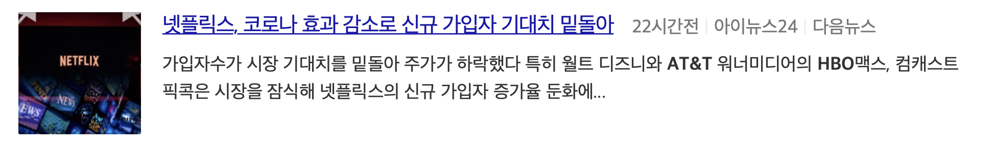 2. 다만, 최근 실적 발표를 한 넷플릭스 마찬가지 이유로 HBO 맥스(온라인 스트리밍 서비스) 가입자 수 증가가 정체되는 등 시장 기대 이하의 실적을 보인다면, 위 기사의 넷플릭스처럼 실적 발표 이후 주가가 더 하락할 수도 있을 것 같습니다.