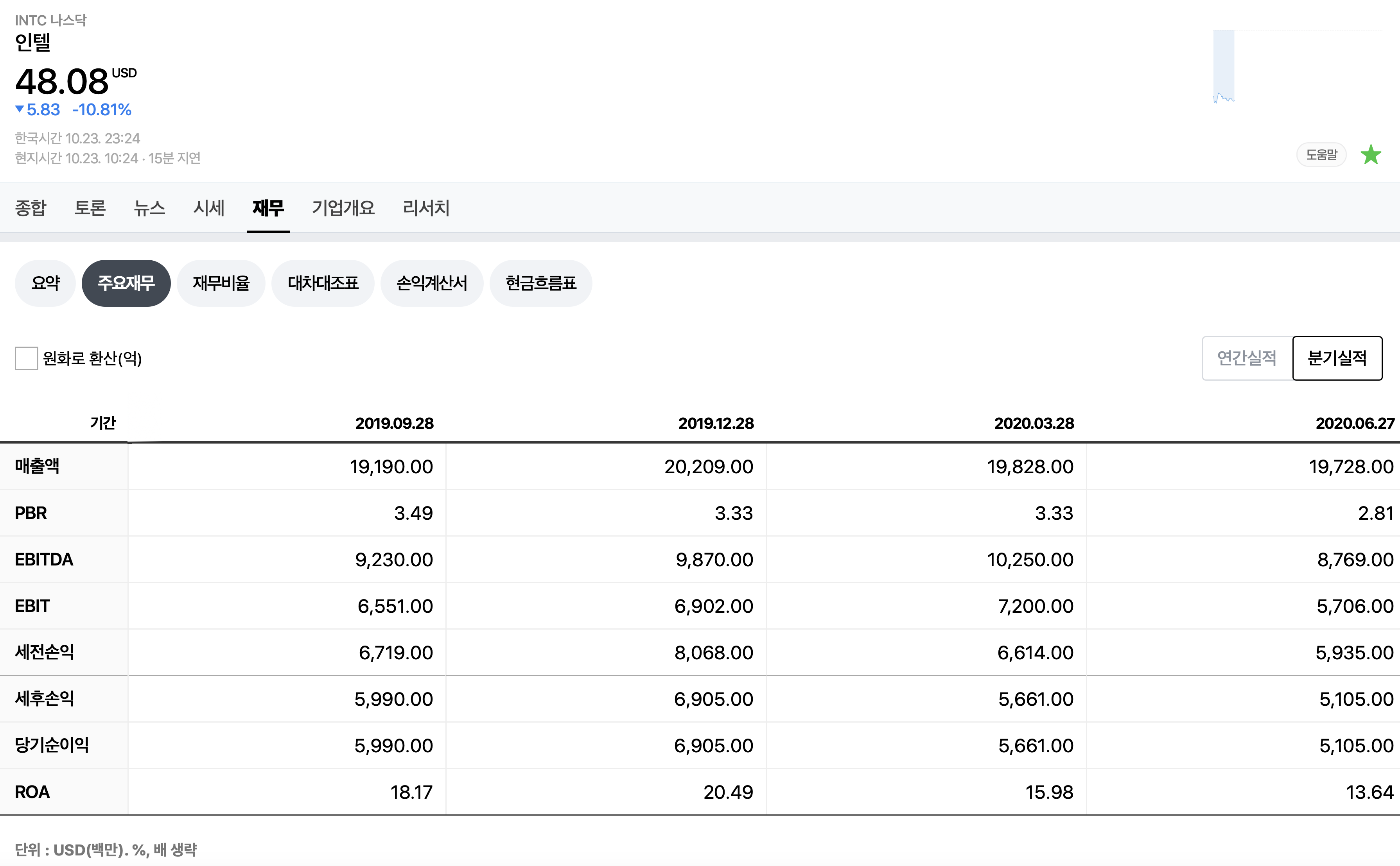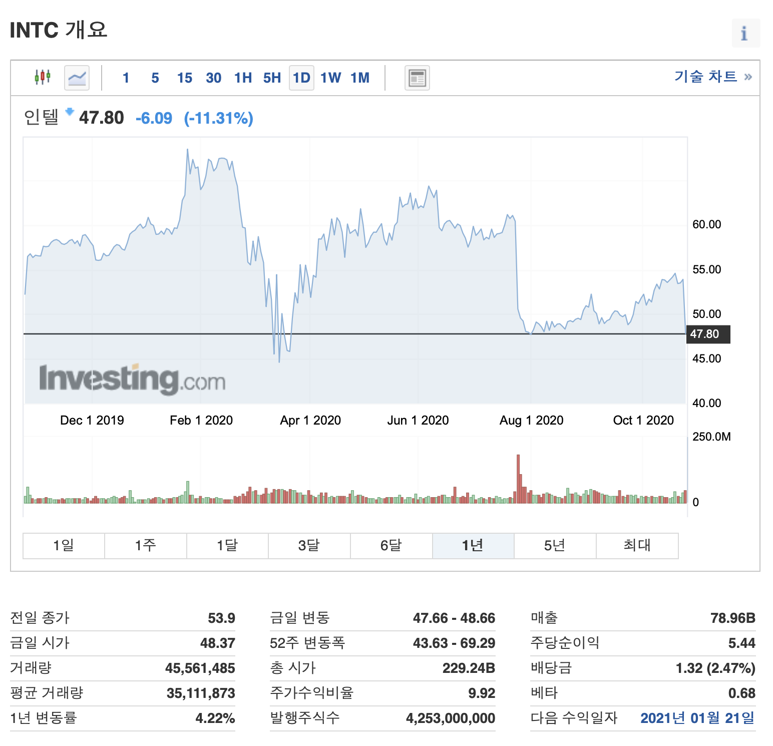 오늘 아침에 제가 보유하고 있는 종목에 대한 주가 변화를 살펴보고 있는데, ‘인텔’ 주가가 급락한 것을 알게 되었습니다.