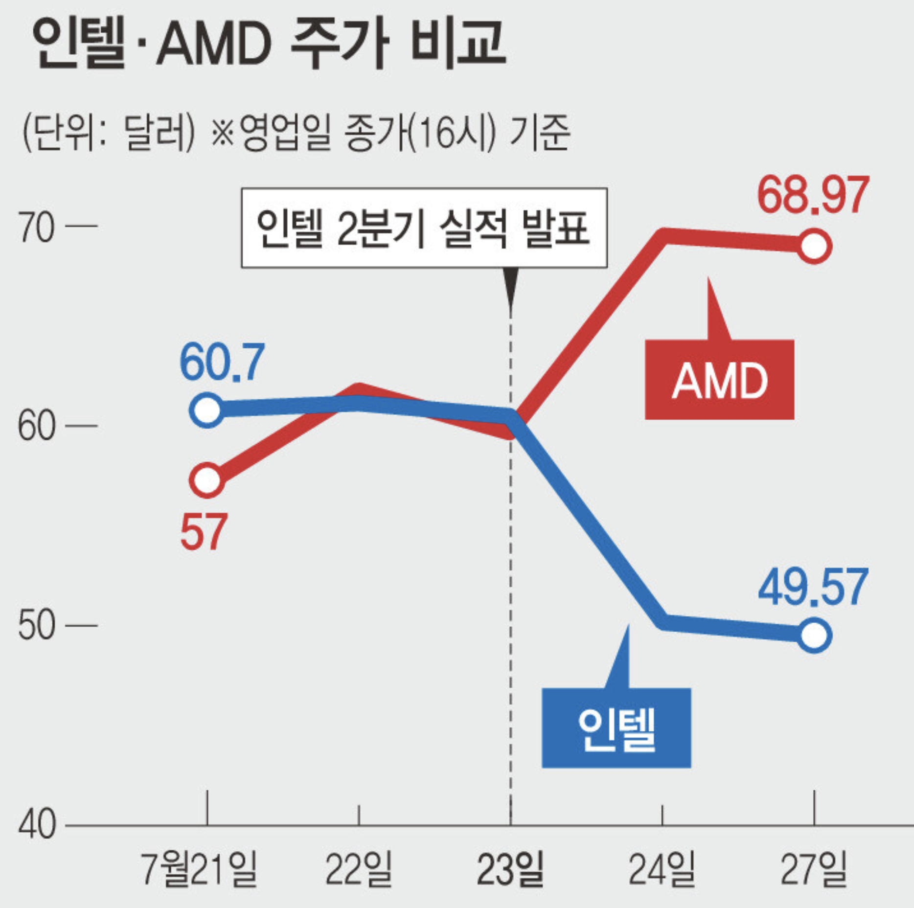 1. '인텔'은 지난 2분기에도 실적 발표 후에도 주가가 급락했습니다.