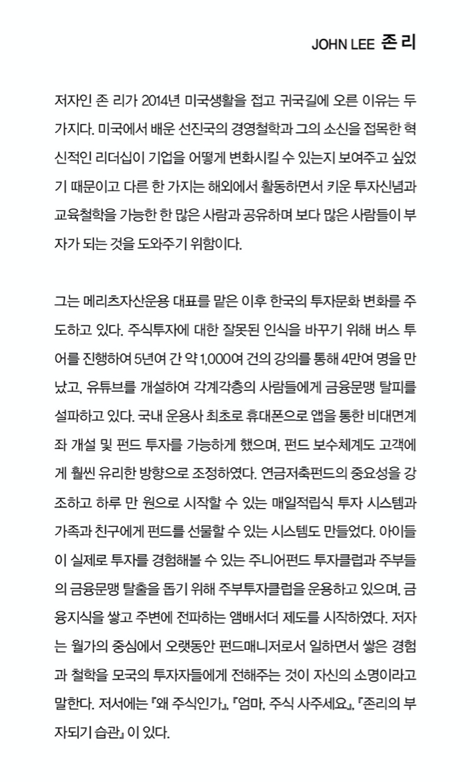 올해는 '존리' (메리츠자산운용) 대표님의 책을 벌써 두 권이나 읽게 되었습니다.