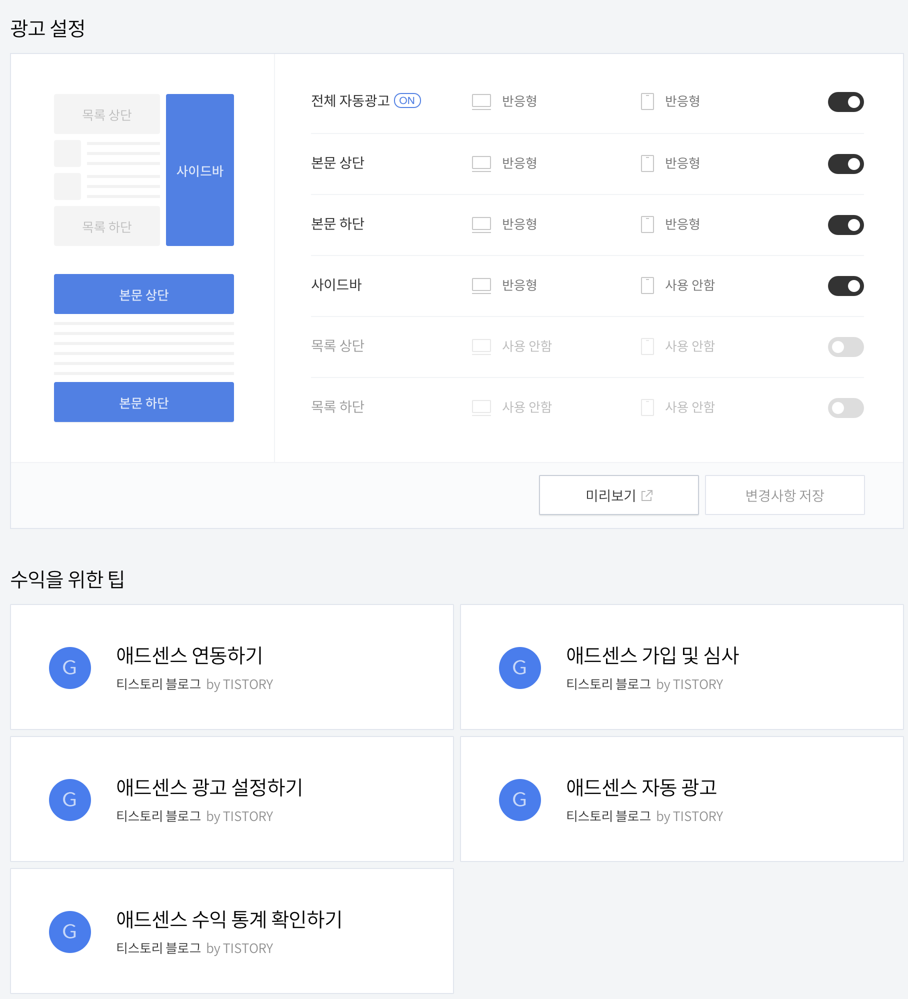 [참고] 그리고 얼마 전부터 티스토리 블로그와 구글 애드센스가 연동되어, 아래와 같이 복잡한 HTML 편집 없이 간편하게 구글 애드센스 광고를 설정할 수 있다는 점에서 이 책에서 이야기하는 상당수 내용이 지금은 평범한 정보, 활용할 수 없는 정보가 되어 버린 것 같습니다.