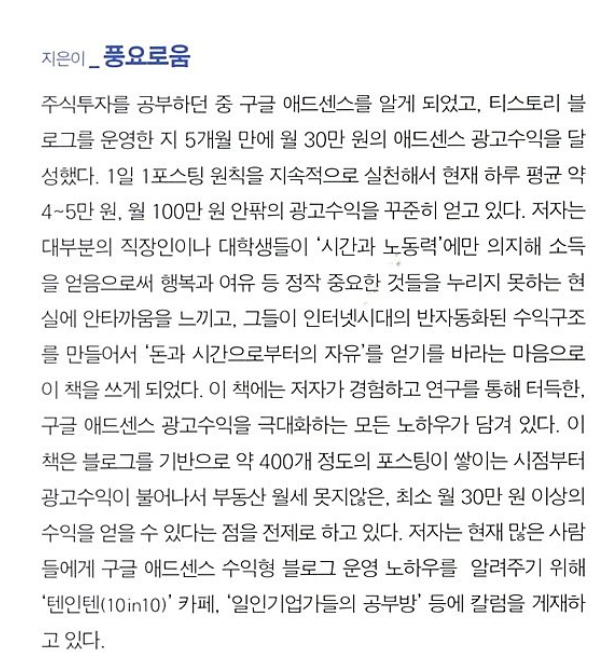 그래서 정체되어 있는 방문자 수, 미미한 광고 수익을 조금은 빨리 개선해보고 싶어서, 구글 애드센스를 통해 월 100만 원 이상의 수익을 창출하고 있다는 '풍요로움'님의 책을 읽게 되었습니다.