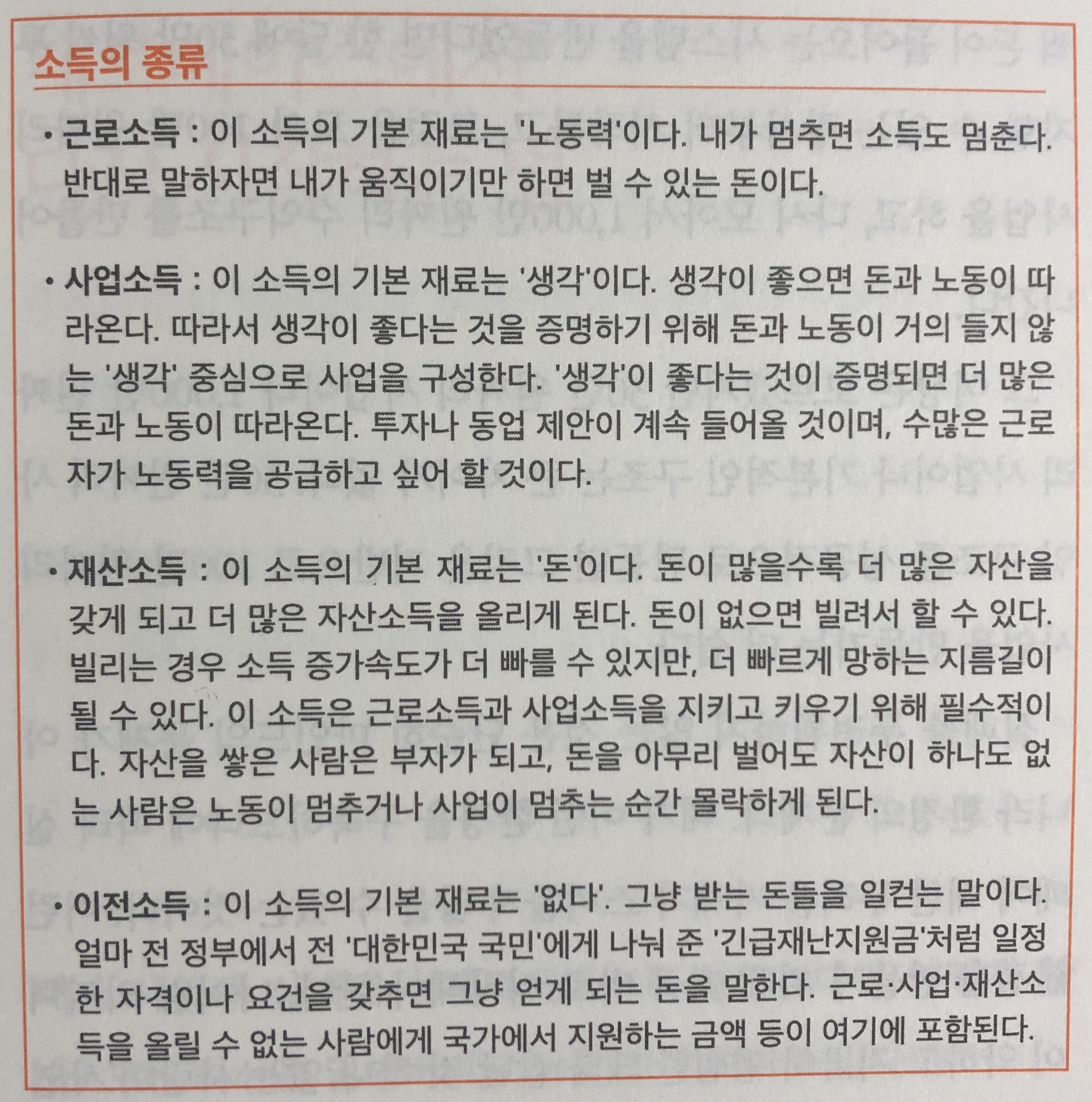 요즘 '부'에 관한 여러 책들을 읽어보면, 항상 공통된 말을 하고 있는 것 같습니다. 그것은 바로 '근로소득', '자본소득' 에 대한 이야기입니다. 진정한 '부'를 얻기 위해서는 '근로소득'을 빠른 시간 내에 '자본소득' 이나 '재산소득'으로 바꿔야 한다는 것입니다.