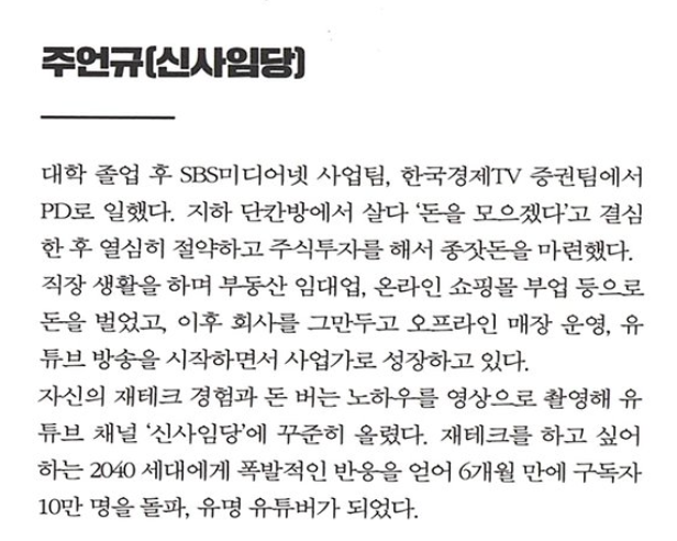 그래서 (비록 '신사임당'님의 유튜브 동영상을 제대로 시청한 적은 없었지만) 젊은 나이에 성공한 그만의 성공스토리를 알고 싶어서 책을 읽게 되었습니다.