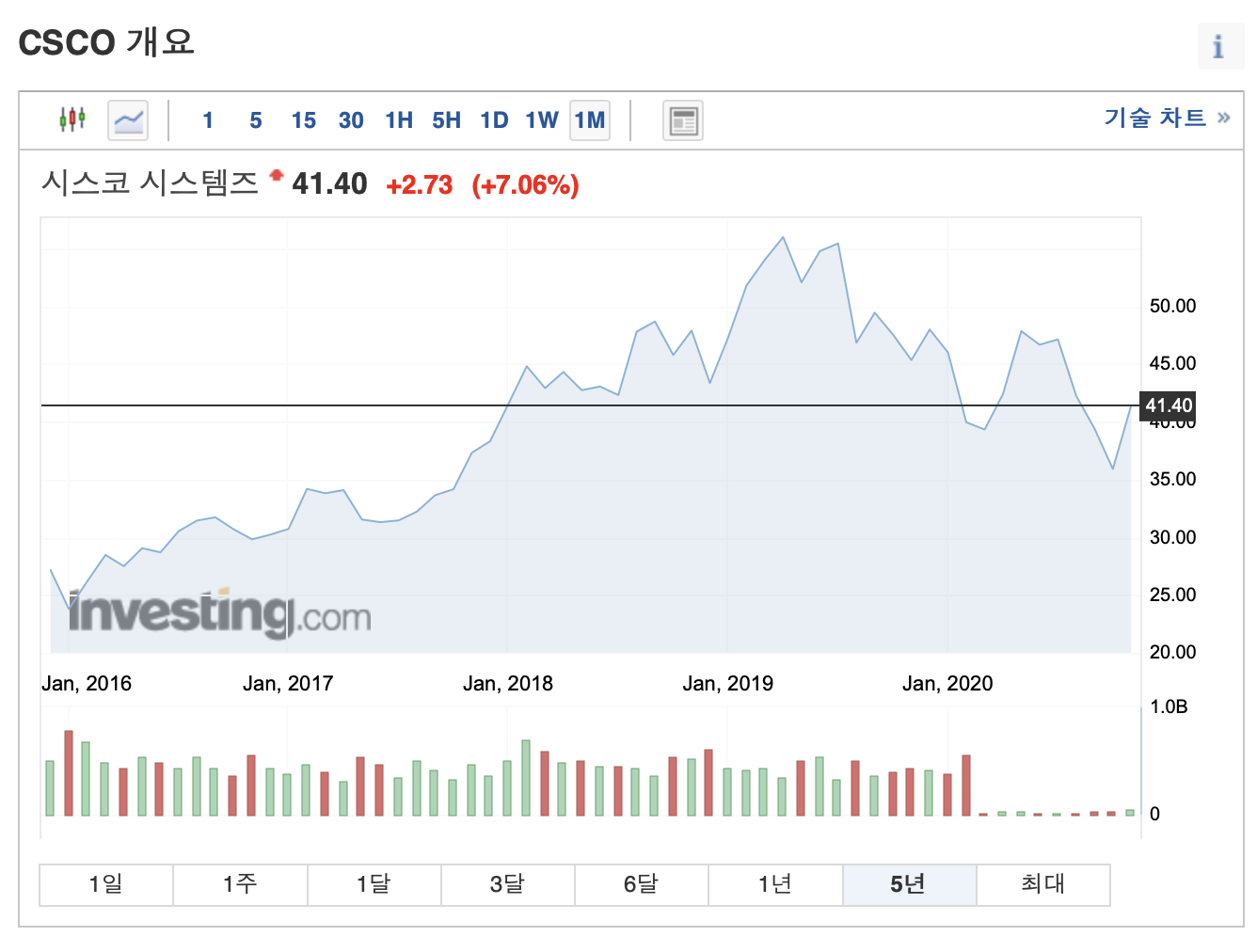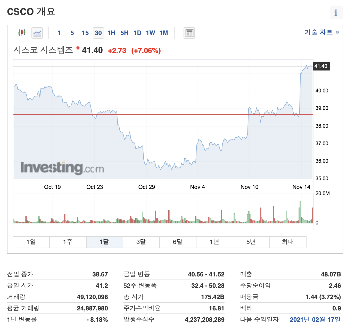 ⊙ '시스코'의 11. 13. 종가(41.40달러)는 최근 1년 최고 주가인 50.28달러보다 약 10% 정도 하락한 가격이지만, 그래도 최근 1달간 가장 높은 주가임을 알 수 있습니다.