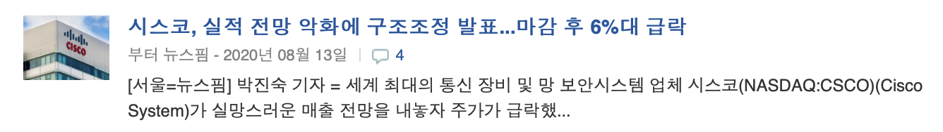 (*타 기업보다는 '시스코'가 실적 발표 이후 주가가 급락하거나 급등하는 경우가 많은 것 같습니다.)