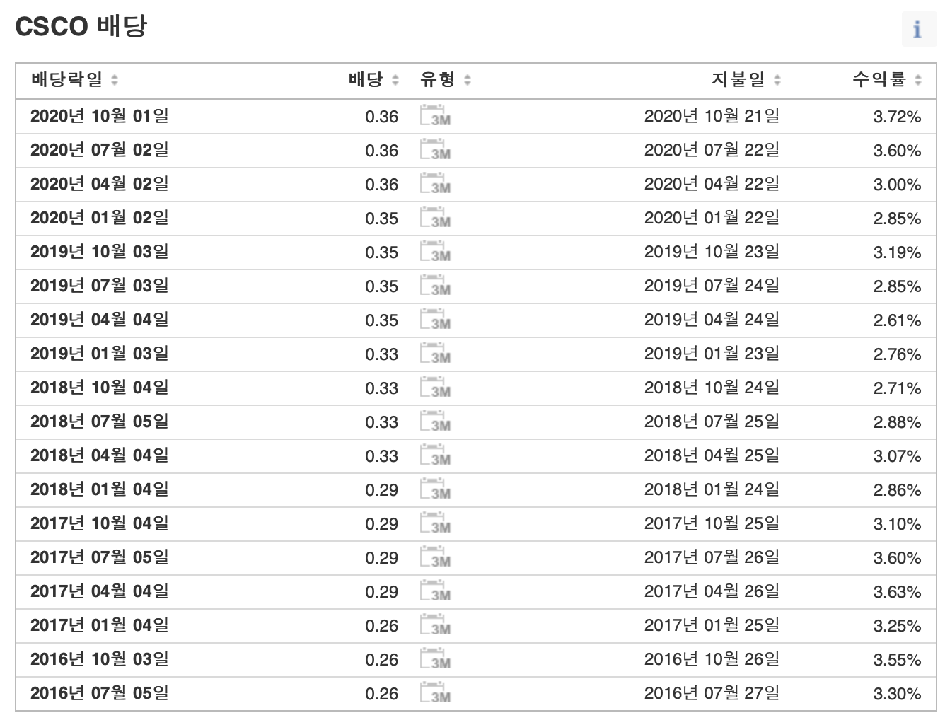 ⊙ 시스코는 매월 1, 4, 7, 10월에 배당금을 지급하고 있습니다.