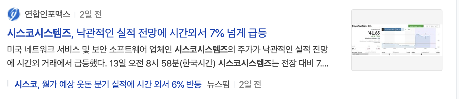 아무래도, '시스코'에 좋은 소식이 있는 것 같아서 몇 주 밖에 보유하고 있지 못한 소액 투자자지만, 관심을 갖고 관련 뉴스를 검색해보았습니다.