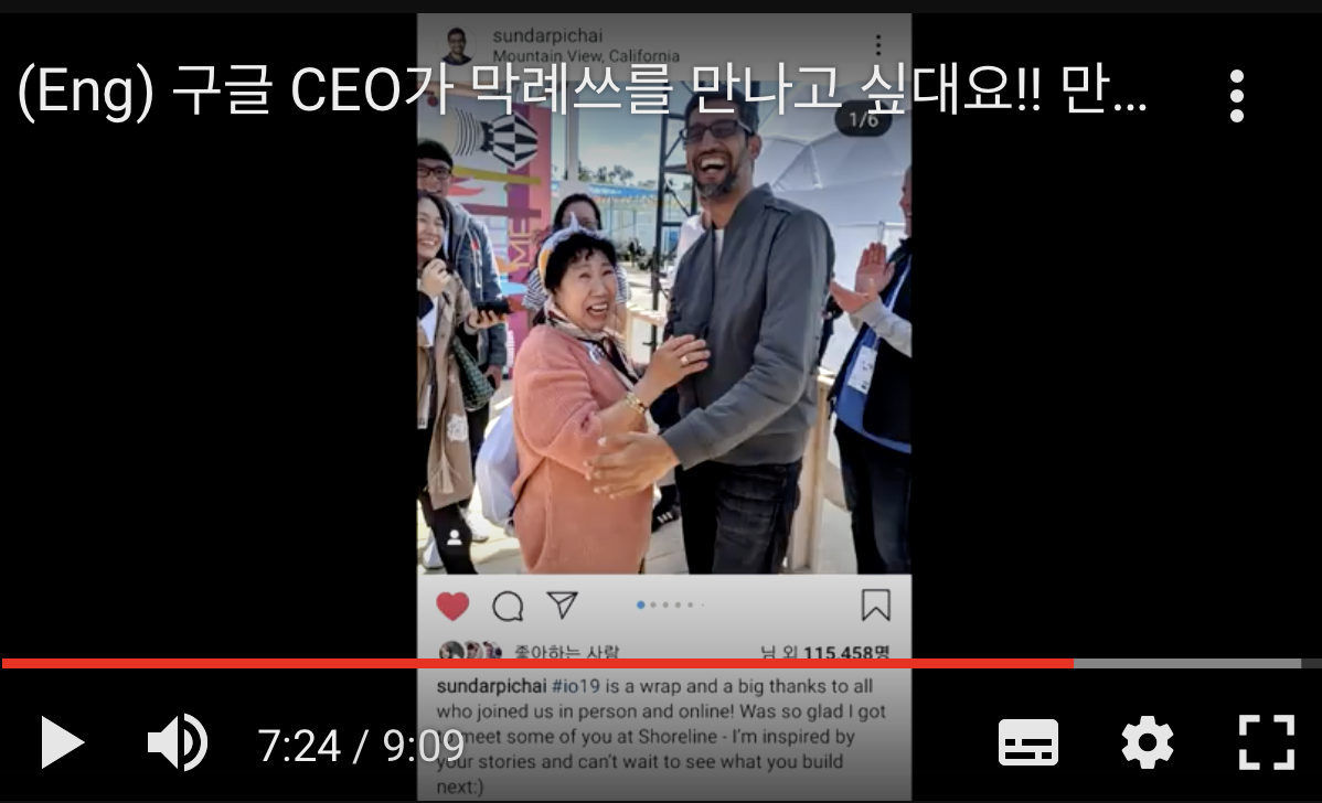 # 마지막으로 '박막례' 할머니가 수잔(유튜브 사장)을 만나고, 순다르 피차이(구글 사장) 만나는 모습을 볼 때 왠지 뭉클해졌습니다.