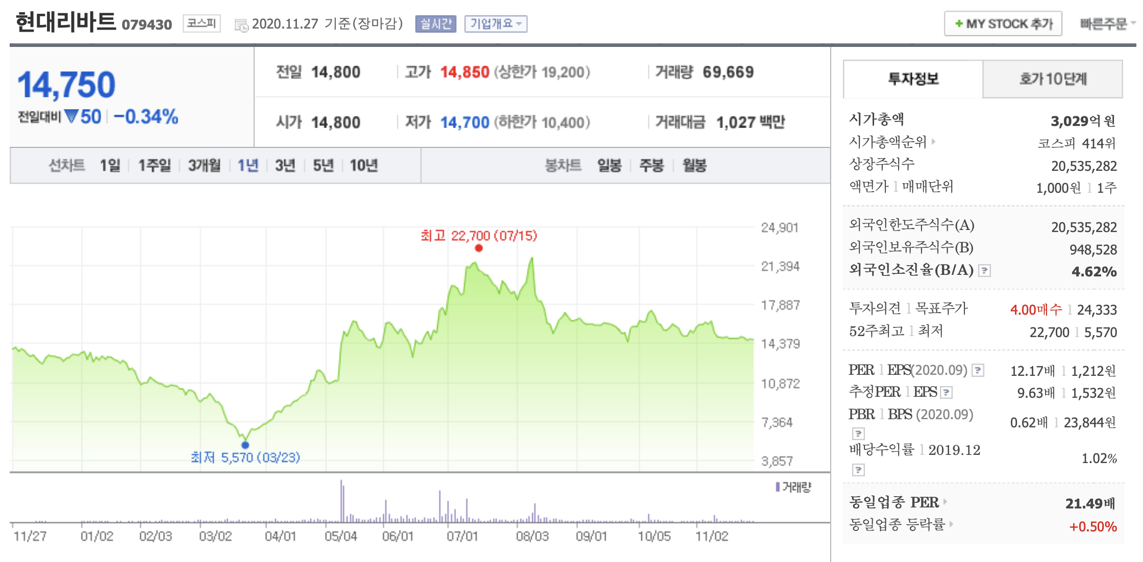 - 52주 최고가 : 22,700원 / 52주 최저가 5,570원입니다. (최고가 대비 산술적으로 약 35% 상승 여력이 있어 보입니다.)
