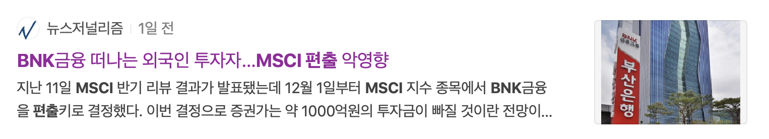 ⊙ ‘BNK금융지주’ 주가와 관련된 최근 이슈로는 "MSCI 편출"