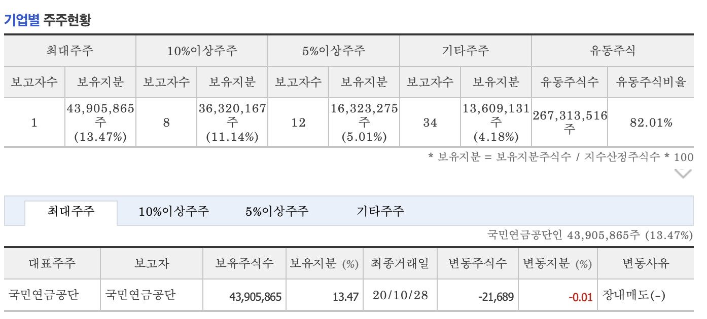 ⊙ ‘BNK금융지주’의 최대 주주는 ‘국민연금공단(13.47%)’이며, 외국인 지분율 45.42%, ‘유동주식 비율’이 82.01% 입니다.