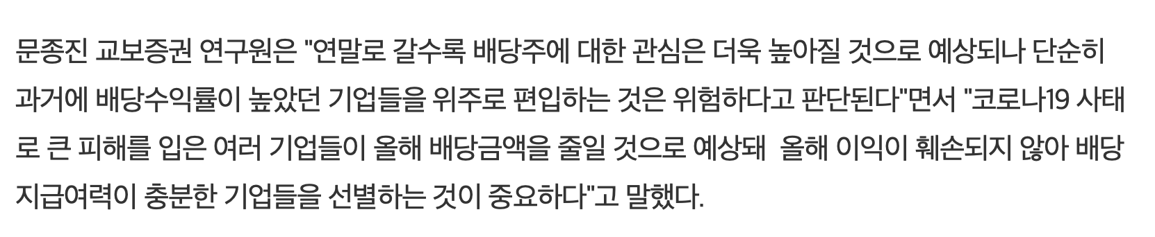 저 역시코로나 19확산으로 소량 가지고 있는 유통주 등을 매도한 금액과 여유돈을 합쳐 12월을 목전에 둔 시기에 배당주를 소량 구입하고자 했습니다.