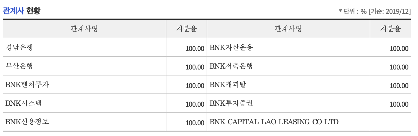 2015년에 GS자산운용(BNK자산운용 사명 변경)을 자회사로 편입하여 은행, 증권, 자산운용, 여신전문, 저축은행업 등을 포괄하는 종합금융그룹이 되었습니다. 2019년 11월 BNK벤처투자 자회사 편입하였습니다.