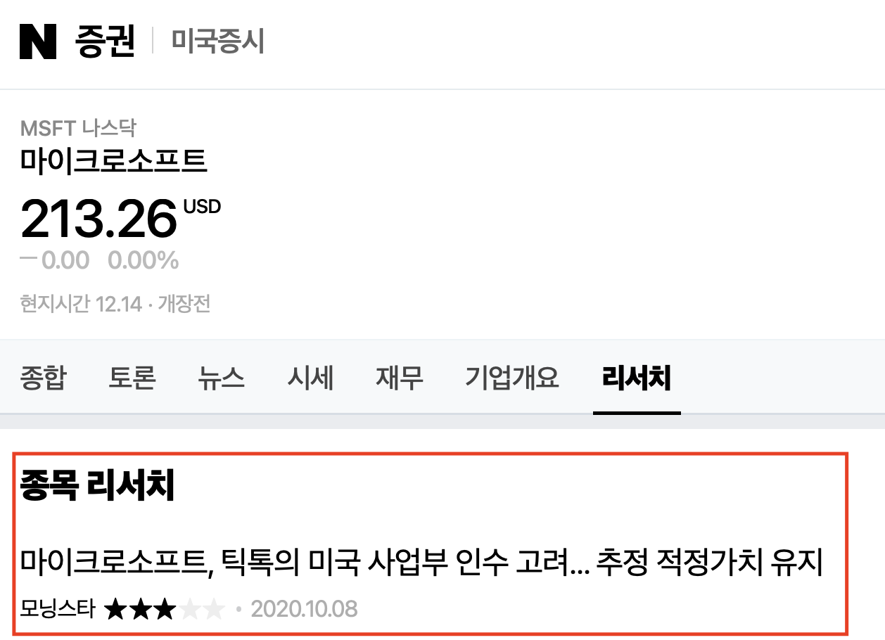 ⊙ 또한, 최근에는 '해외 종목'도 시세나 그 외에 간단한 '종목 리포트'도 확인할 수 있게 개편되었습니다.