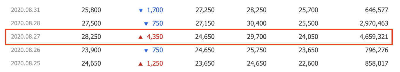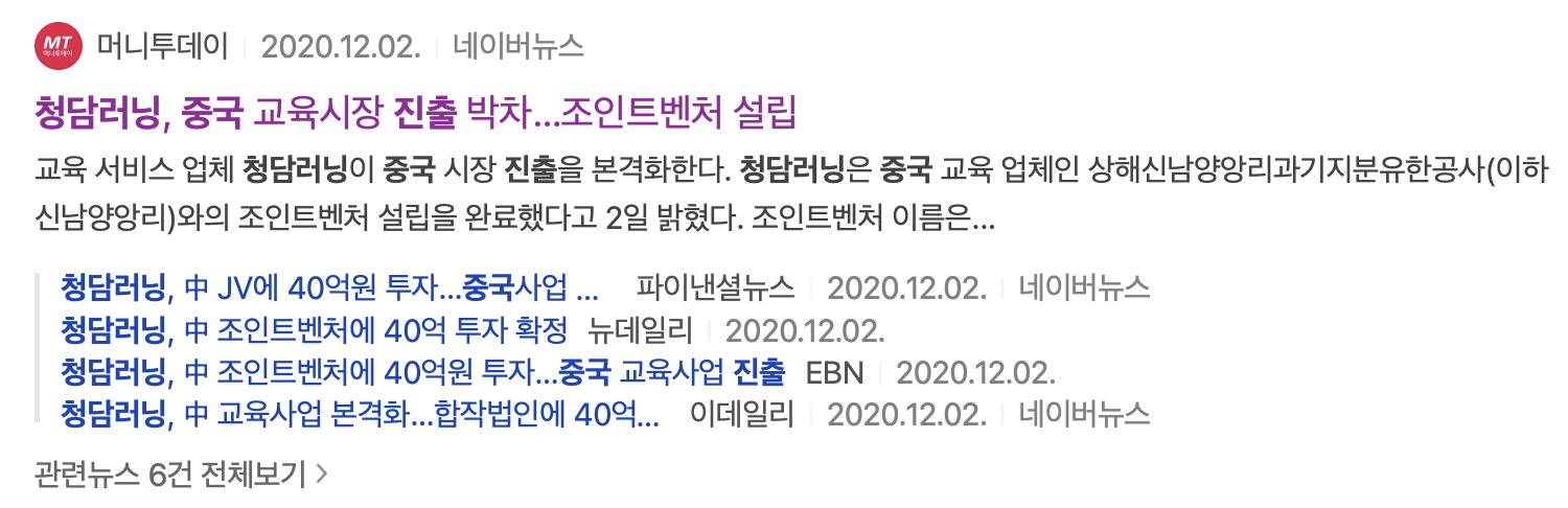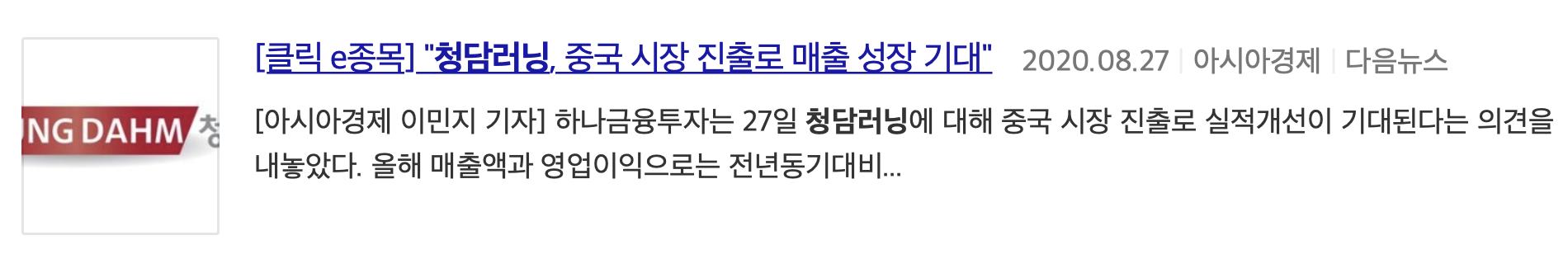 5. 특히 '청담러닝'은 중국 영어 교육 시장 진출과 소식과 함께 2020. 8. 20. '19,150'원이던 주가가 2020. 8. 27. '30,400'원까지 급등하였습니다. (다만, 그 후에는 주가 상승분을 모두 반납하고 다시 2만 원 초반대에서 횡보하고 있습니다.)