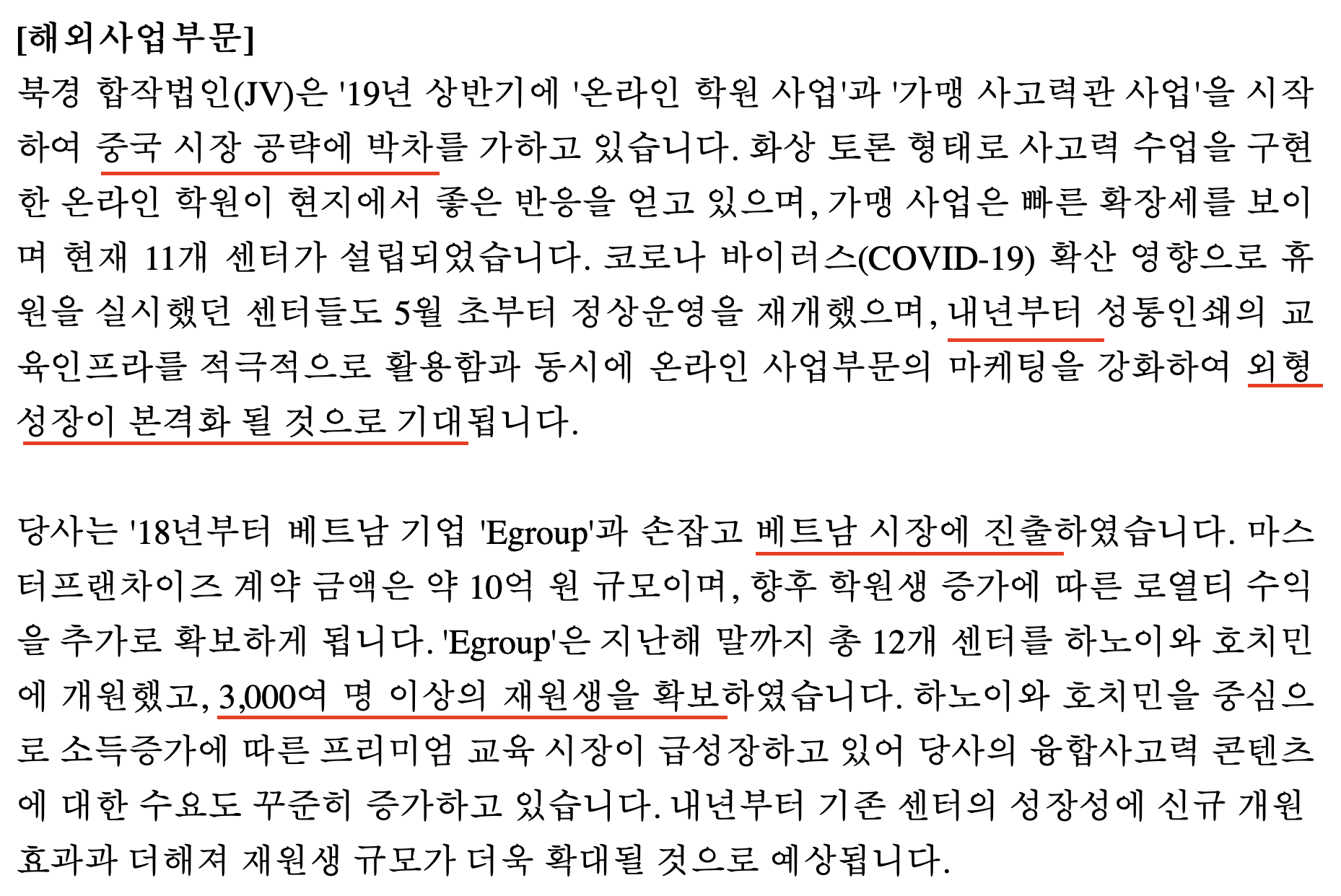 (*'청담러닝' 관련 자료를 찾아보면, 중국 시장 진출에 따라 2021년부터는 본격적으로 학생당 5달러의 로열티 발생이 예상된다고 합니다.)