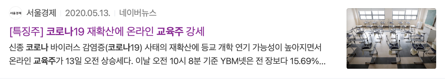 (*다만, 교육주 중에서도 온라인 교육이 불가능하거나, 오프라인에 특화된 종목의 경우에는 좋지 않은 실적을 보일 수 있기 때문에 같은 업종이라도 선별적으로 확인할 필요가 있을 것 같습니다.)