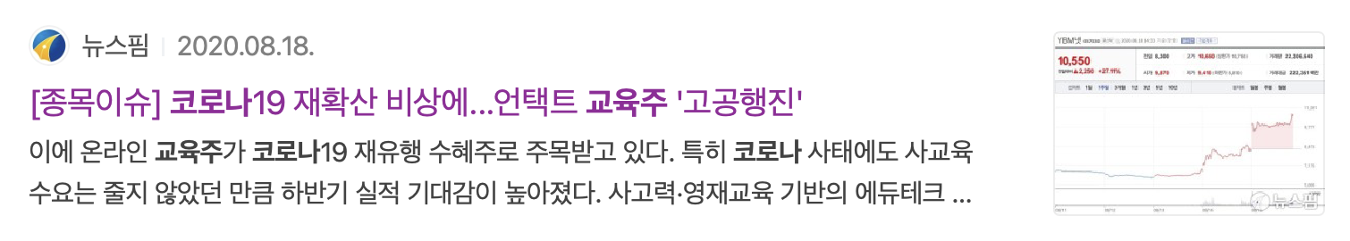 ◈ 마지막으로 코로나 재확산으로 언택트주에 대한 관심이 높아지면(이슈화되면), 다시금 '청담러닝'이 수혜주로 주목받을 수 있을 것 같습니다.