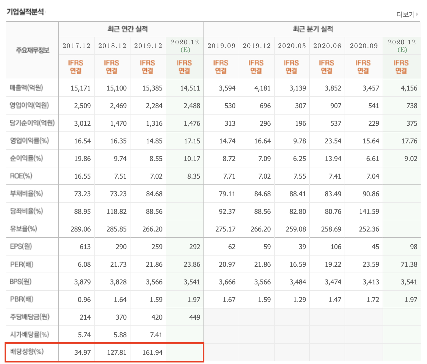 ⊙ 실적 악화, 이익잉여금 활용 등 여러 가지 이유로 배당성향이 100%를 초과할 수도 있습니다.