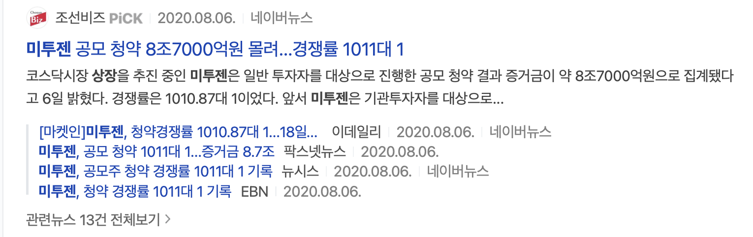 - 다만, '미투젠'의 경우 공모 청약에 8조 7,000억 원의 자금이 몰렸음에도 (경쟁률 1011대 1) 아직까지는 주가가 크게 상승하지 못하고 있는 것 같습니다.