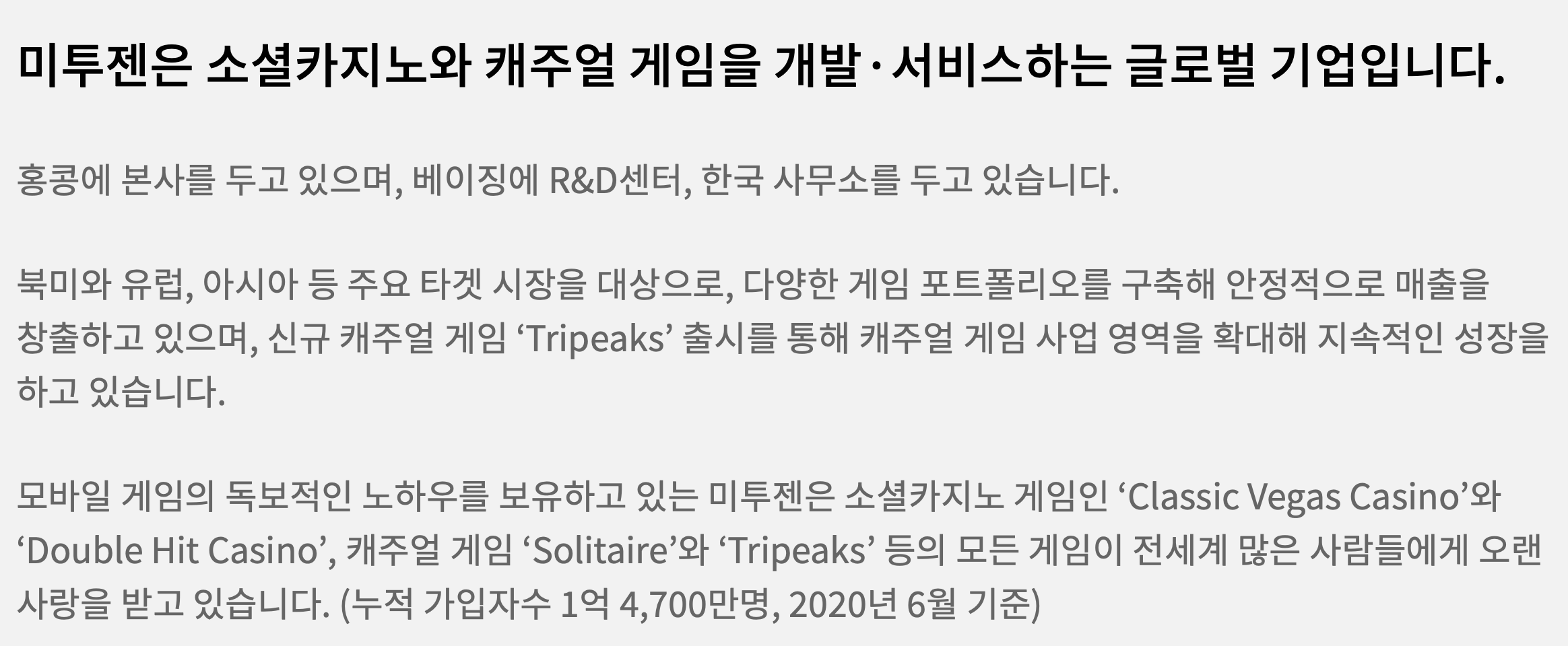 - '미투젠'은 현재 다양한 플랫폼을 활용하여, 소셜카지노, 솔리테르, 트라이픽스 등 3개 장르에서 42개 이상의 다변화된 게임 포트폴리오를 구축하여 게임 서비스를 제공하고 있습니다.