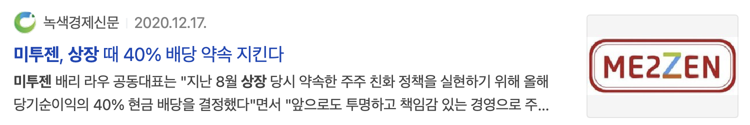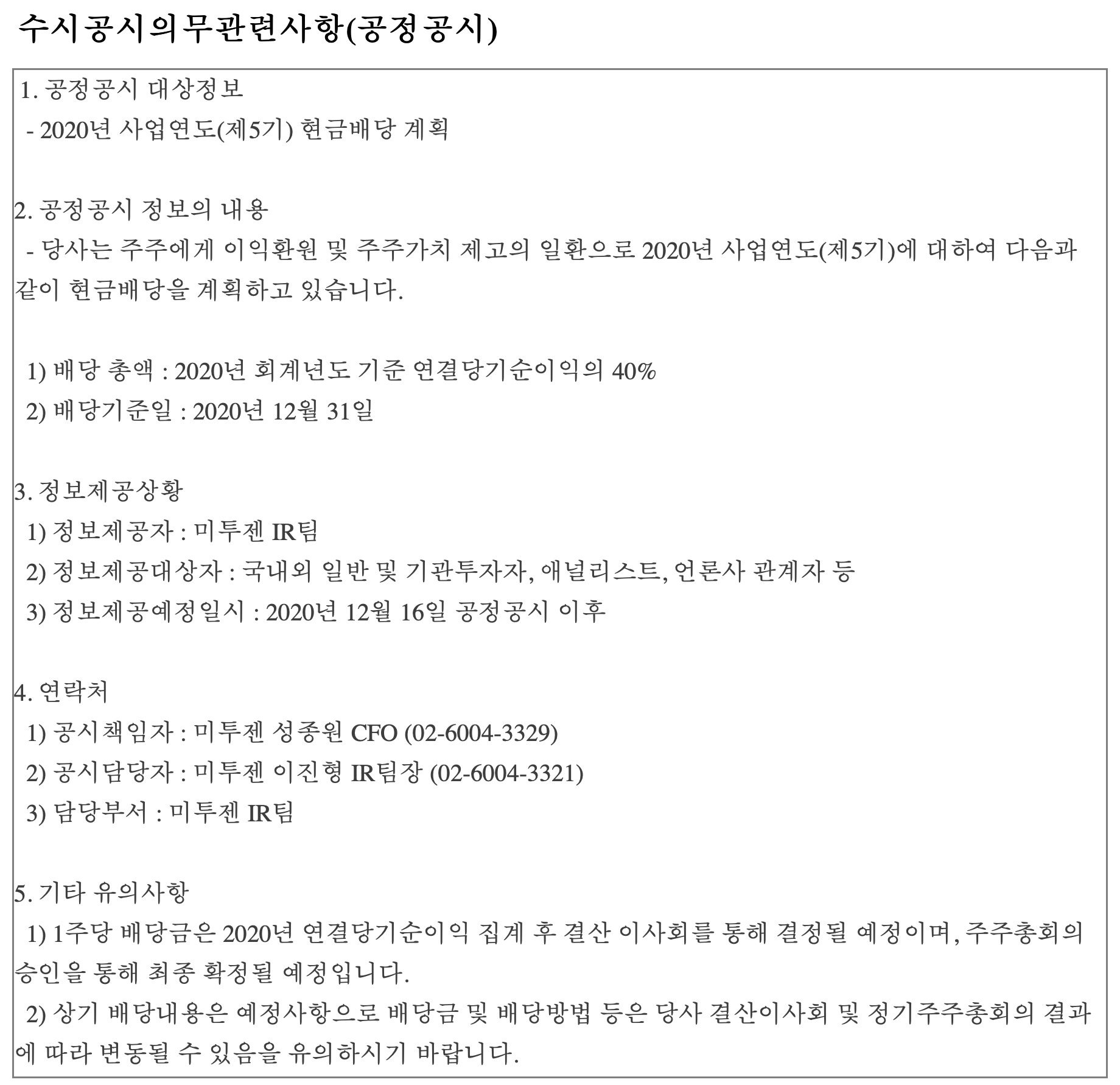 - '미투젠'의 최근 공시를 살펴보면, 2020년 회계연도 기준 연결 당기순이익의 40%를 배당금으로 지급할 계획이라고 합니다.