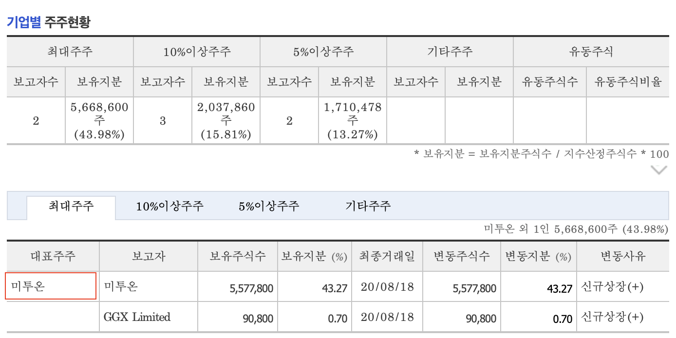 *미투젠은 '미투온'이 최대 주주로 20. 8월 기준 43%의 지분을 보유하고 있습니다. (*미투젠은 미투온의 자회사)