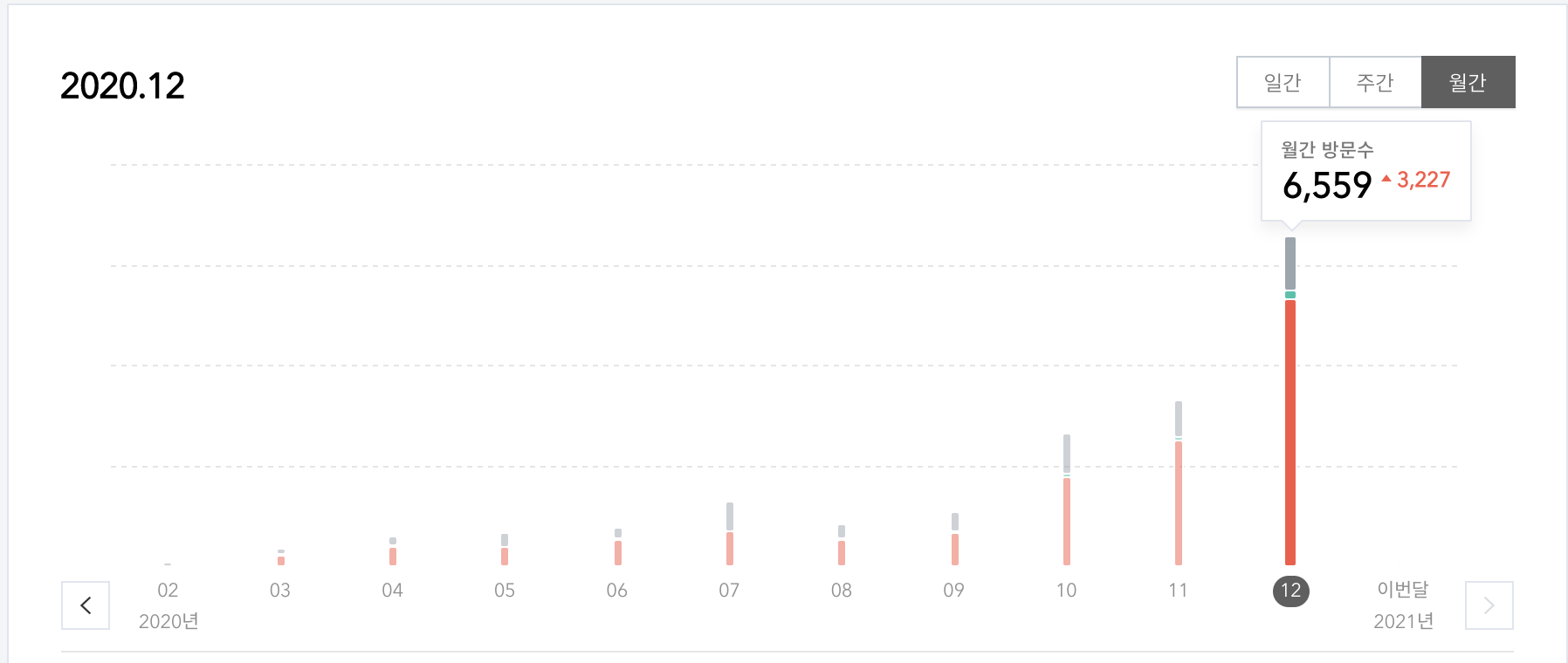 ⊙ 2020. 12월에는 총 6,559명이 블로그를 방문했습니다. 지난달보다 3,227명 / 49% 정도 유입자 숫자가 증가하였습니다.