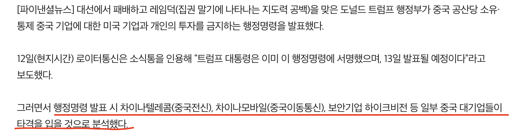 3. 제가 '차이나모바일'을 계속 보유하고 있는 동안에도 트럼프 행정부의 '행정명령'(미국인의 투자 금지)에 대한 여러 뉴스 기사가 나왔음에도 불구하고 아무런 조치(매도)를 하지 않은 사실이 안타까운 마음이 많이 생기는 것 같습니다.