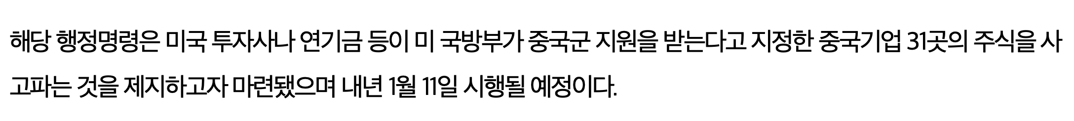 종목에 대해 트럼프 행정부가 중국군과 관련된 기업이라는 사유로 현지시간 21년 1월7일 ~ 11일사이에 주식 거래를 중단한다고 발표 하였습니다. 정확한 중단일을 발표 된 것이 없으나, 위와 같이 거래정지가 유력한 일자가 발표 되었기 때문에 매매에 유의 부탁드리겠습니다. 또한 거래정지 후 기존 주식에 대해서